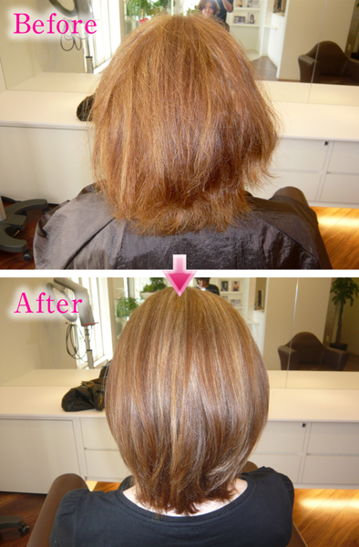 | トナーとは、トーン(色調)です。 微アルカリタイプのもを使用し既染毛(毛先など)の色が抜けた部分に色の補充処理する方法です。弱った毛先にはトナーが最適です。 |